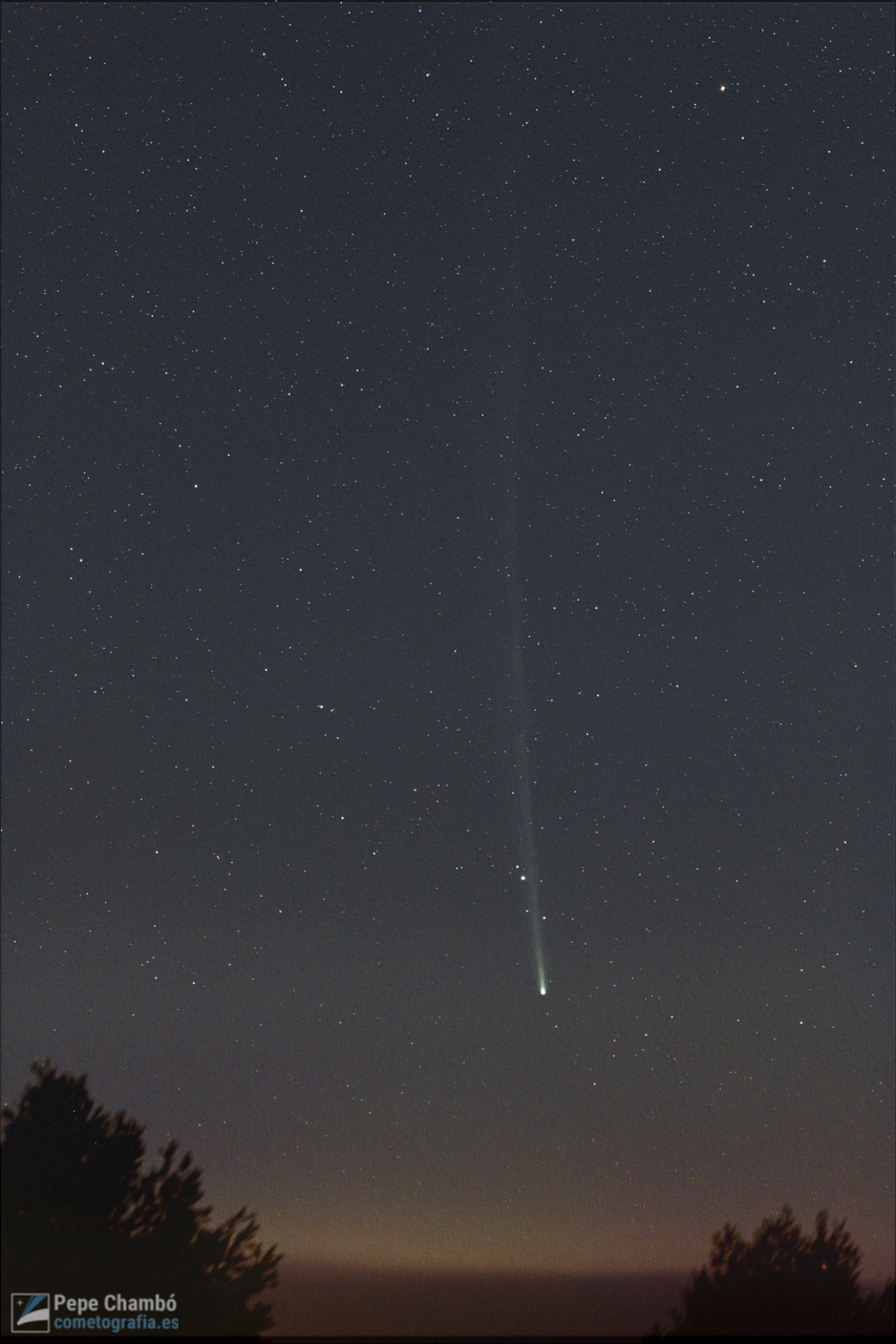 Fuente: https://rastreadoresdecometas.wordpress.com/2023/09/12/c-2023-p1-nishimura-9-de-septiembre-de-2023-por-jose-chambo/Descripción: El cometa C/2023 P1 (Nishimura) fotografiado durante el amanecer del 9 de septiembre de 2023, a una altitud de 1027 metros desde los Altos de Salomón, Valencia. La luna menguante iluminó el fondo celeste en esta zona rica en estrellas de la constelación de Leo, mientras el cometa ascendía en el cielo mostrando una cola extremadamente larga de más de 7 grados de longitud que se extendía más allá del marco del teleobjetivo. Aunque es imperceptible a simple vista y solo se puede observar la parte más brillante con binoculares, la fotografía logra capturar la cola iónica estrecha y curva, mostrando detalles en forma de filamentos que fluyen hacia el lado izquierdo de la corriente principal. Unos minutos más tarde, una densa niebla cubrió toda la cumbre, y tuve que despedirme del cometa Nishimura hasta dentro de 435 años. J. J. Chambó